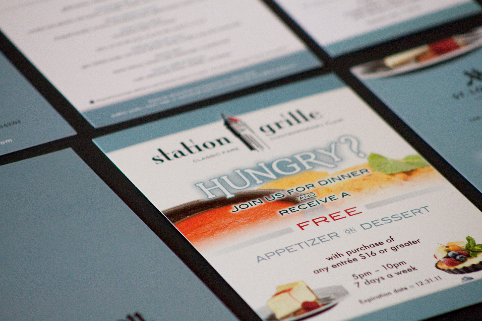 Series of print and sign design that I created for St. Louis Union Station Marriott. Station Grille is their main restaurant within the hotel. The designs are to advertise to engage guests to eat within the convenience of the hotel instead of going into town.